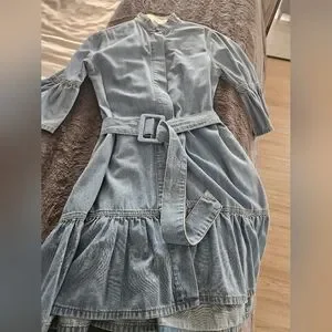 Rare farm rio denim dress with a belted waist. Features a ruffled hem and sleeves. Perfect for casual outings. Size S. Snap front. EUC.
