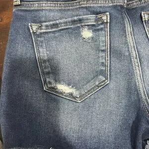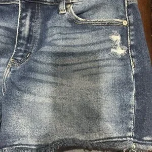 Trendy distressed jean shorts. Frayed hem for a casual look. Perfect for everyday wear.