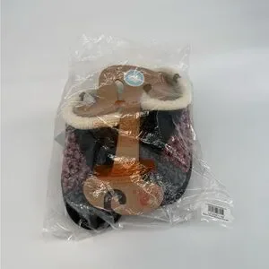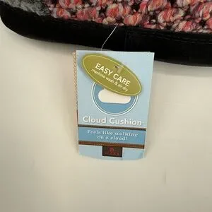 Soft knit slippers with cloud cushion. Features a blend of black, gray, and pink hues.