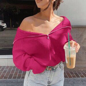 Hot Pink Casual Women's V Neck Half-Zip Lapel Ribbed Sweater