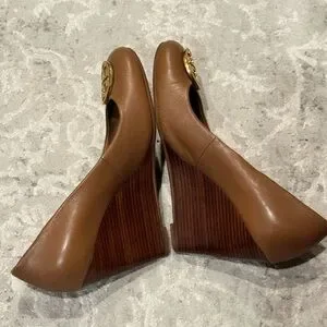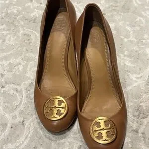 Tory Burch Tan Leather Wedges with Gold Logo Size 6