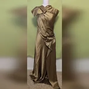 Step into elegance with this stunning mossy green satin evening dress. Perfect for any formal occasion, this dress features a luxurious drape and a sophisticated silhouette. Elevate your style with this timeless piece.