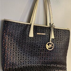 Chic Michael Kors tote with intricate black pattern. Gold handles and logo charm add elegance. Ideal for versatile style.