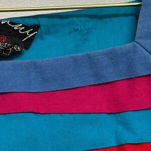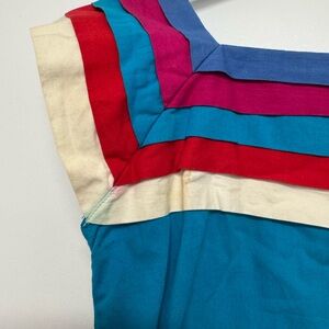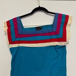 Vibrant teal blue women's top featuring a striking combination of magenta, red, and cream. Contains front strings at the middle of the top: The vintage cotton blouse from Gemmy is great for adding a pop of color to your wardrobe.