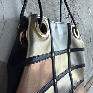 Y2K metallic patchwork tote in gold, silver, bronze, and gunmetal panels with black trim. Medium bucket shape with gold-tone grommets, magnetic closure, and lined interior. Equal parts city-girl glam and everyday practical she pairs with denim or all black.