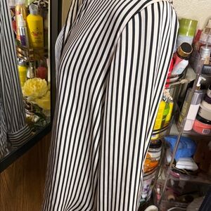 Stylish black and white striped blouse. Features a classic collar and button-down front. Perfect for any occasion.