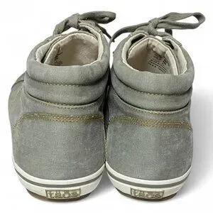 The Taos Top Star Sneakers in Washed Olive Green Sage are a stylish and comfortable choice for women in size 9.5. With a round toe shape, lace-up closure, and flat heel, these sneakers are perfect for casual or travel occasions. The distressed style adds a trendy touch, while features like arch support, cushioning, and comfort make them a practical choice for all-day wear. Made with canvas fabric and a rubber outsole, these sneakers are both durable and fashionable, making them a versatile addition to any wardrobe.