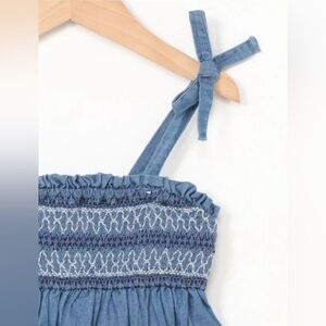 Two-piece Gap set: blue denim blouse and skirt with small white designs, and the blouse has a bow on the strap.