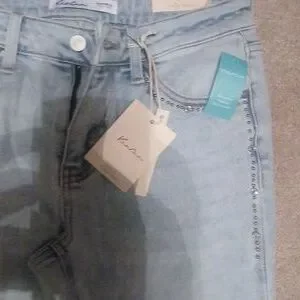 Stylish light blue flare jeans. Features subtle embellishments. Perfect for casual wear.
