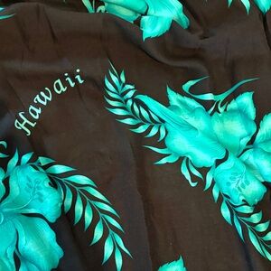 Beautiful authentic Unity Trading Hawaii maxi dress in black with teal tropical floral print.