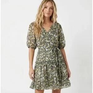 NWT Current Air M Gray Floral Wrap Dress Ruffle Mini V-Neck Puff Sleeve Cottage
