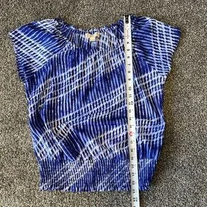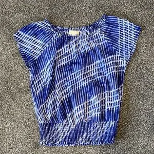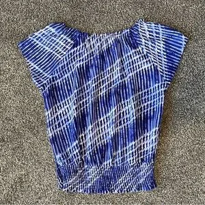 Chic blue and white blouse. Features a unique pattern. Ideal for casual wear.