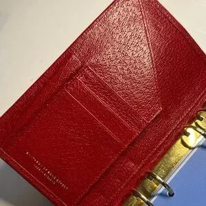 Rarely seen Smythson of Bond Street 6-Ring Organiser with dual interior pockets, 3 cards slots and brand stamp at interior. Includes original box, dividers and gold edged notes inserts. Made in England. Truly gorgeous and an unusual luxury find.