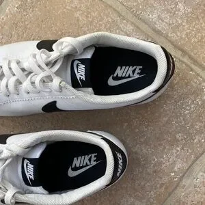 Crisp white Nike trainers with bold black swoosh. Ideal for everyday style. In great condition.