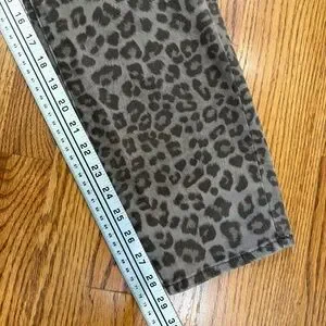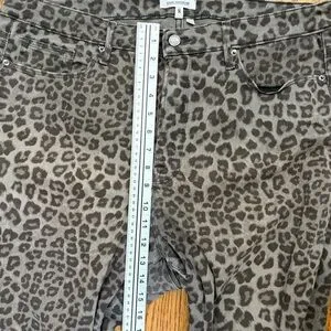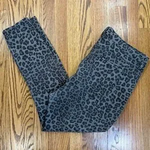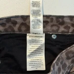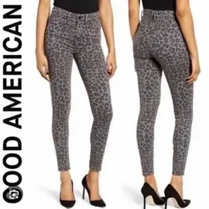 Good American Good Legs grey leopard print skinny jeans, a high-rise ankle jeans featuring a stretchy denim. Signs of wear on inner thighs as pictured.