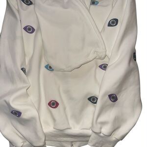 Lola and the boys Stylish white hoodie featuring a vibrant eye pattern in blue, pink, and black. Perfect for a bold look. Excellent use condition. Slight discoloration by one pocket shown in pictures. Super cool zip up. Size M.