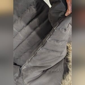 Color: Graphite. Please sell all photos. This show signs of normal wear and would be brand new with a cleaning from a authorized dry cleaner. This was my MIL's coat and she has a smoke free and pet free home. Purchased directly from Canada Goose