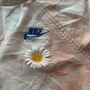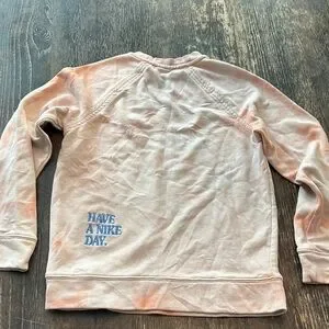 Nike crew neck sweatshirt with a tie-dye pattern in kids size Large. Features a small daisy and Nike logo. Ideal for everyday comfort.