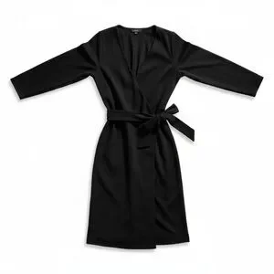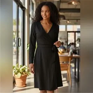 Elegant black wrap dress. Features a tie waist. Perfect for any occasion.
