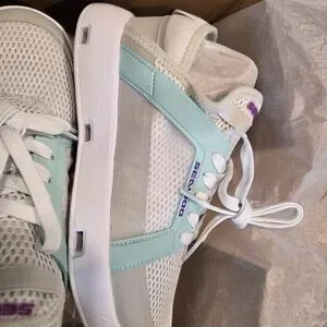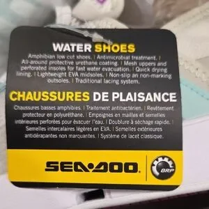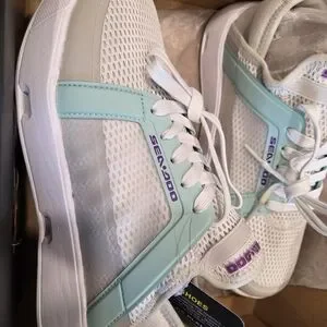 Sea-Doo sneakers in white with purple and teal accents. Ideal for use at the boat docks! Protect your feet while doing your favorite extreme watersports! New With Tags. Box Included. Tip of one the shoes laces has "extra" material from factory. Its protective, but discolored.