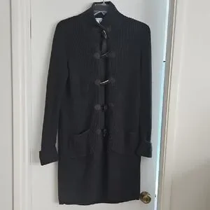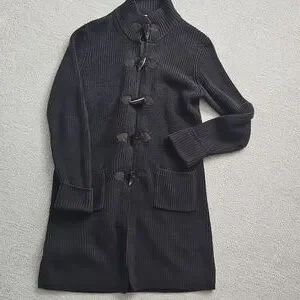 This is a gorgeous, high quality brown 100% cotton knit cardigan. It is heavy and long enough to wear as a coat in the right temperature. It has wonderful details such as the suede interfacing in both sides of the opening, suede button loops, and the "horn" toggle buttons. It has turned up cuffs, and pockets. In excellent shape, barely worn. It can fit medium or large - check measurements, which are laid flat and not stretched: