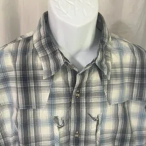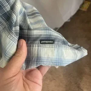 Patagonia Men's ivory and blue plaid short sleeve moisture wicking shirt XL EUC