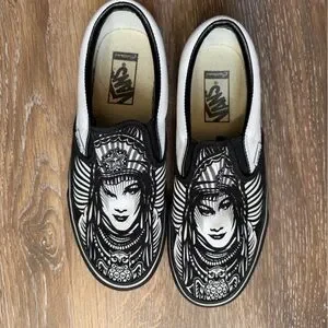 Size men’s 7, women’s 8.5 vans slip on. Special collab designed by Shepard Fairey (Obey). Lightly worn, no box.