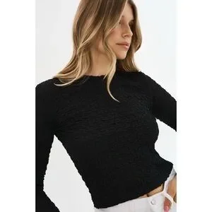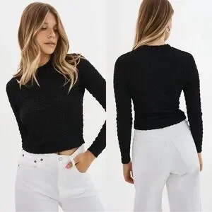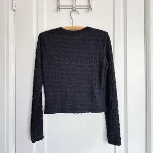 Fabulous long sleeved crop top by LAMARQUE. “Nandra Top” style in super stretchy bubble textured semi-sheer black knit. Bust 33-41“, length 18.5“. Size M, brand new with tags.