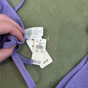 Stylish purple ribbed bikini set. Features a halter top and tie-side bottoms.