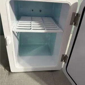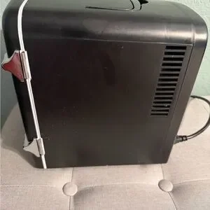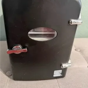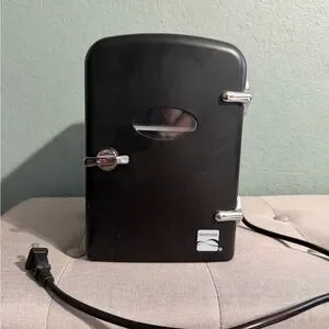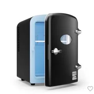 Keep your essentials cool with this sleek black and blue mini fridge. Perfect for home organization and storage.