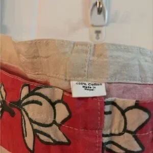 Brand new - Unique overalls made from Magnolia feed sack. Features red and cream colors with floral and horse accents. Two pockets on the back. Wooden buttons on the straps to adjust length. Hip width will be 25.5”. Inseam is 24”. PTP is 24”.