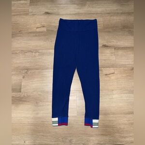 Vibrant royal blue leggings with distinctive red and white striped cuffs. Perfect for both active and casual settings.