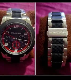Michael Kors Caine Chronograph Men's Watch, Model MK8474. This sophisticated timepiece features a bold black dial with red accents and three sub-dials. The stainless steel case is paired with a durable black silicone and silver-tone link bracelet for a modern, sporty look. Includes date function and tachymeter bezel. Excellent condition, appears new without any visible wear on the crystal or band. Perfect for everyday wear or as a statement automotive-inspired accessory. Needs battery