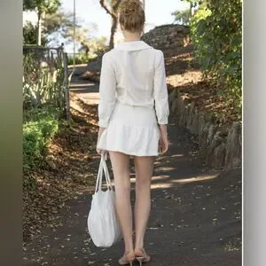Mini skirt with frill detail at hem. Buttons at front. Zipper closure at back.