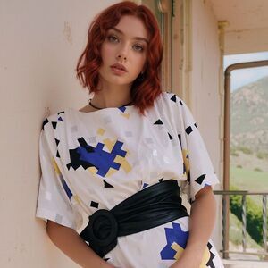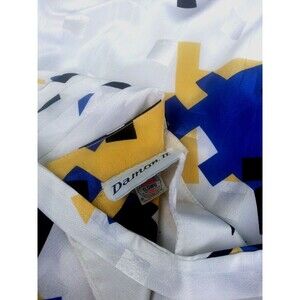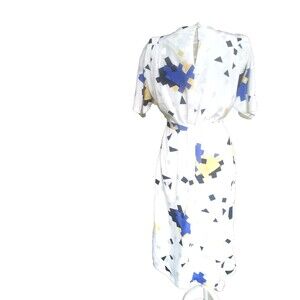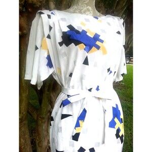 Vintage boxy geometric shiny cubes abstract angular art deco 80s shift belted dress. Estimate a size large, but could possibly wear more slouchy loose as a medium or belted. Please go by measurements below to ensure fit. Shift features a round neckline, pullover closure, and midi dress length. Made from fabric with shiny white, yellow and royal sapphire blue against a white background. Dress comes with a skinny matching sash belt. (BLACK BELT NOT INCLUDED). Dress features, padded shoulders and angular accents. Its 80s vintage style with geometric pattern and sharp lines gives off a retro and abstract vibe, making it stand out in any wardrobe. The bright blue color and kimono sleeves add a pop of color and sophistication to this lightweight and belted dress from Damon II. Photo shows the original ILGWU tag, but it fell off. There is no fabric content or care tag, but it seems a polyester or poly blend. Recommend dry clean. Excellent pre-owned condition.