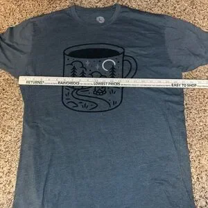 Explore the outdoors with this blue graphic tee featuring a unique mug design. Ideal for casual wear and nature lovers.