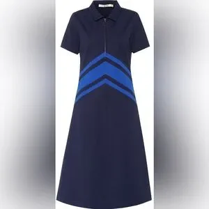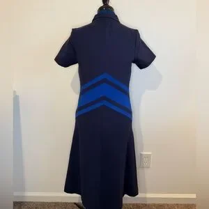 Elegant navy blue dress featuring a stylish chevron design. Perfect for any occasion.