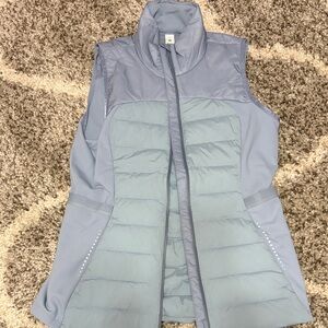 Stay warm and stylish with this light blue puffer vest. Perfect for layering, it offers comfort and a sleek look.