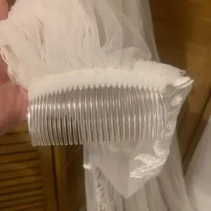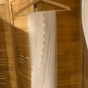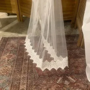 A gorgeous made with love bridal cathedral length veil 3M (118inches) Soft white/ivory sheer tulle with lace embroidered trim all along the full edge of the veil from top to bottom. Comes with attached comb. Veil was a shop sample in excellent condition.