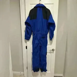 Nothing like a one piece ski suit to keep the snow and cold at bay, no matter what your activity: works great for everything from vintage day to snowmobiling. Treated nylon water resistant and windproof fabric, uninsulated, tricot lined. One hip and two chest pockets, interior gaiters, velcro arm cuffs, belted. In amazingly good condition considering its age, just a few minor signs of wear.