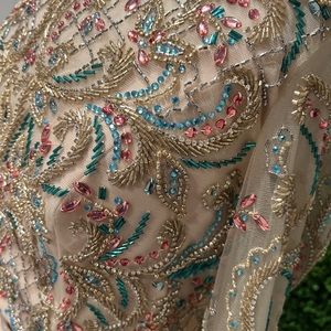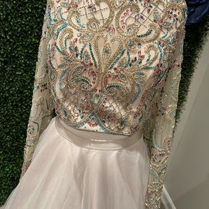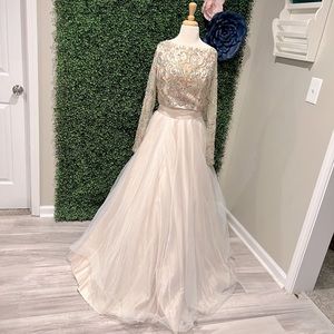 Elegant long sleeve dress by Tiffany Designs. Features intricate gold detailing on the bodice. Flowing cream skirt adds grace.