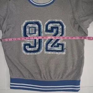 Size XS Measurements provided Women's - PILCRO PINNY ANTHROPOLGIE Gray color with Blue and White Lace Trim 92 on the front Also has Blue and White Trim on the crewneck collar, the sleeves and the HEM the Material is 100% Cotton in good pre-owned condition Note sold out on website