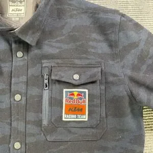 Red Bull KTM Racing Team shirt jacket features a dark tiger-stripe camouflage pattern with a quilted interior lining for added warmth. Designed with a snap-front closure and a classic collar, it includes two chest flap pockets and an additional vertical zip pocket on the left chest adorned with the official team logo patch. The heavy-duty fabric and functional design make it an ideal outer layer for fans of motocross and racing.