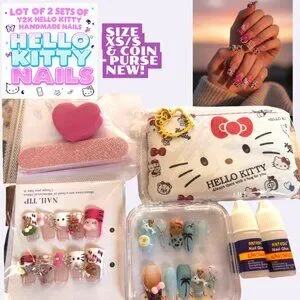 BUNDLE OF 2 HANDMADE HELLO KITTY PRESS ON FAKE NAIL SETS PLUS MINI HK ZIP POUCH 3X4" NAIL FILE 2X GLUE (CUT TIPS TO USE)