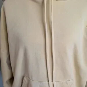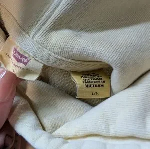 Levi's women's relaxed oversized slightly cropped hoodie in pale pastel yellow and 100% cotton, size L. Great everyday piece in a slightly faded distressed wash for laid back comfort and soft girl aesthetic. Pairs well with leggings or jeans, such a soft and thick fabric. Classic embroidered Levi's text logo on chest