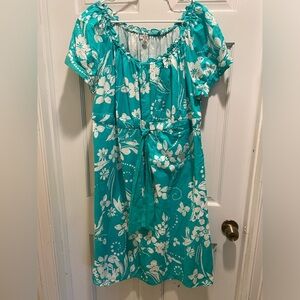 Charming teal dress with a floral pattern. Features white accents and a tie waist.
