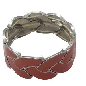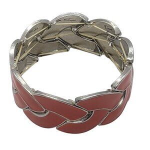 This vintage bracelet showcases a distinct braided design with orange enamel inlays and a silver-tone finish. The stretch band ensures a comfortable fit and complements retro-inspired outfits effortlessly.
