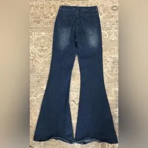 Dark blue flare jeans with stylish button accents. Perfect for a bold look.