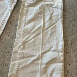 Elegant white jeans with a wide leg design. Braid around waist. Perfect for a chic and relaxed look.