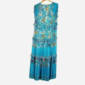 A showstopping NWT Hemant & Nandita maxi dress in vibrant turquoise — handmade in India with the artisan craftsmanship this beloved luxury boho brand is known for. Vivid multicolor floral and leaf print in 100% viscose with ruffle tiered detailing throughout, a V-neckline, sleeveless cut, and fully lined silhouette. Lightweight and flowing — the kind of dress that was born for a vacation, resort, garden party, or any occasion that calls for something truly special. Original retail $498 — new with tags, never worn.